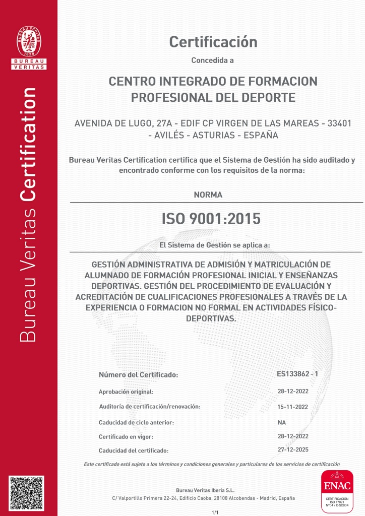 CERTIFICACIÓN DEL SISTEMA DE GESTIÓN DE LA CALIDAD DEL CIFP DEL DEPORTE - ESTÁNDAR UNE-EN ISO 9001:2015